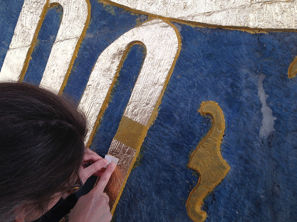 Auf dieser Grundlage erhielten Uhr und Inschrift im Zuge der aktuellen Restaurierung ihre rekonstruierende Neufassung. Zunächst wurden die historischen Fassungsreste gereinigt und die Oberfläche mit einer Acryldispersion gefestigt. Risse und offene Fugen wurden mit Kalkmörtel geschlossen. Die schwarze Fassung erfolgte mit Acrylfarben. Für die Vergoldung kam extra starkes Doppelgold mit 23,75 Karat zur Anwendung. Das hauchdünne Blattgold wurde auf einer Acrylmixtion (eine spezielle Grundierung für Vergoldungen) angeschossen.