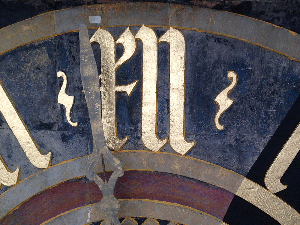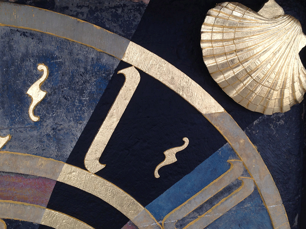 Wie die ursprüngliche Farbigkeit der Uhr aussah, ist nicht bekannt. Spätestens seit 1875 war das Ziffernblatt schwarz gefasst.1 Schon zur 100-Jahrfeier 1715 ist eine Vergoldung der Zeiger genannt.2 Sämtliche historische Fotografien zwischen Anfang des 20. Jahrhunderts und 1960 zeigen dieselbe Farbigkeit: schwarzes Ziffernblatt mit vergoldeten Zahlen, Zeigern und Muscheln.3 Die aktuelle Neufassung orientiert sich an diesem Befund. Die vor der Restaurierung sichtbare Fassung mit Blau und Rot gelangte erst 1965 zur Ausführung.4