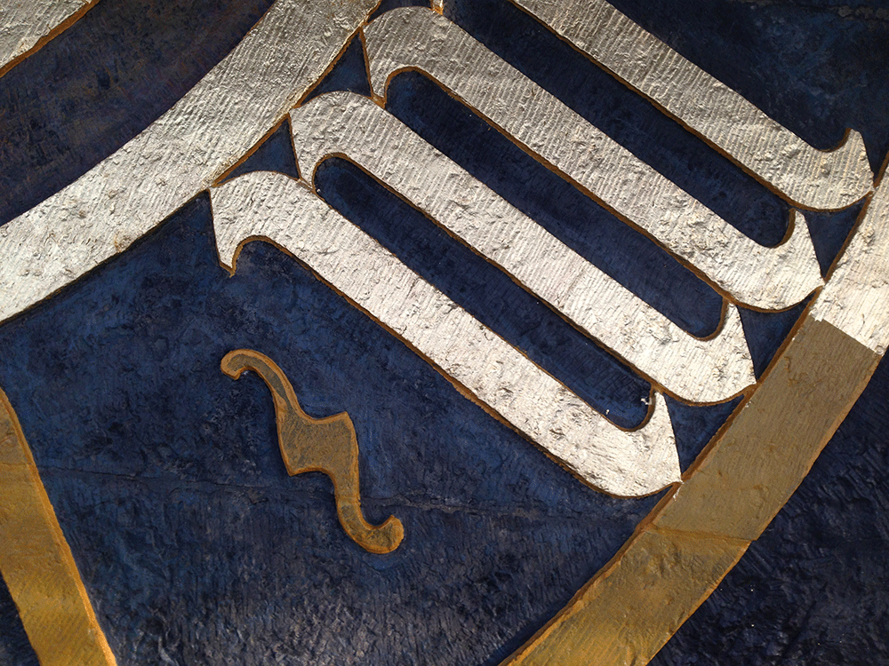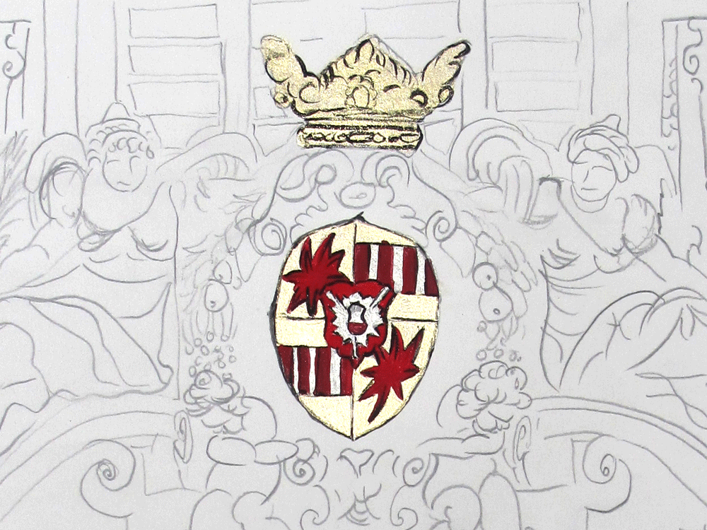 Auf dem Wappen sind viele Reste der historischen Fassungen erkennbar. Die jüngsten stammen von 1965 aus der letzten großen Renovierungsphase, die ältesten vermutlich aus dem ausgehenden 19. Jahrhundert. Bei der umfassenden Restaurierung um 1895 wurde die Fassade gereinigt und wohl von allen älteren Anstrichen befreit. So haben wir es heute mit einem fragmentarischen Mischbestand zu tun, dessen einzelne Schichten nicht ohne weiteres voneinander zu trennen und einzelnen Bauphasen zuzuordnen sind. Da die Farbigkeit der einzelnen Wappenteile über die Jahrhunderte deutliche Unterschiede zeigt, lohnte sich an dieser Stelle eine ausführlichere Recherche.