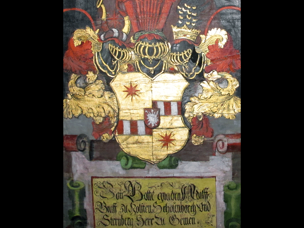 Das Wappen von Fürst Ernst entspricht dem seines Vaters Otto IV. Beide waren Grafen zu Holstein, Schaumburg und Sternberg und Herren zu Gemen.