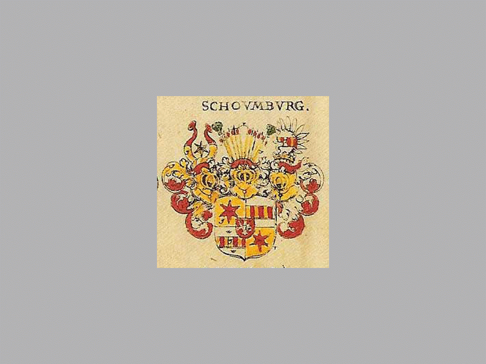 Auch bei Hauber heißt es: »Das erste und vierte Feld aber waren golden, hatten einen roten Stern, das Wappenzeichen der Grafschaft Sternberg. Das zweite und dritte waren ebenfalls golden, enthalten die vier roten und drei silbernen Balken von Gehmen. Diesem war in der Mitte das schaumburgische Nesselblatt wie jetzt aufgeheftet.«12