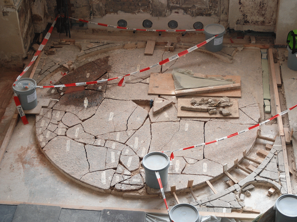 Zur Realisierung dieser Zielsetzung waren umfangreiche Konservierungsmaßnahmen zur Stabilisierung des Originalbestands notwendig. Dazu zählten die Reinigung der Oberflächen sowie die Verfüllung von Rissen und Hohlstellen. Den südöstlichen Kreis nahmen wir vollständig auf und replatzierten die Einzelsegmente in Hochbrandgips. Die Zwischenräume sowie alle sonstigen Fehlstellen ergänzten wir angepasst an den Originalbestand. Der Ergänzungsmörtel besteht aus Hochbrandgips, die Deckschicht enthält zusätzlich Natursteinsplitt verschiedener Körnung. Diese Mischung färbten wir, abgestimmt auf den Originalbestand, mit Trockenpigmenten. Abschließend wurde der Terrazzo geschliffen und versiegelt.