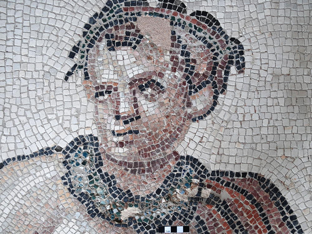 Zwei in die Wand eingebaute Mosaikspolien haben wir ausgebaut und den rückseitigen Zementmörtel entfernt. Als neuen Träger erhielten sie einen Kalkmörtel und wurden in V4A-Rahmen gesetzt. Die Vorderseiten haben wir gereinigt und entsalzt. Mosaikfehlstellen in Ornamenten wurden in Mosaiktechnik mit Naturstein ergänzt. Fehlbereiche im Bereich figürlicher Darstellungen haben wir mit einem Mörtel in einer neutralen Farbe geschlossen. Anschließend erfolgte der Wiedereinbau.
