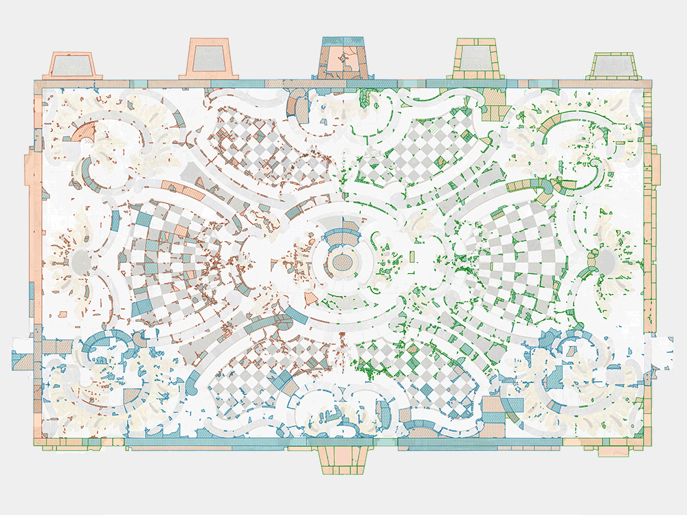 Im Rahmen der Konservierung und Restaurierung des Saals fertigten wir Kartierungen des Vorzustands und der von uns ausgeführten Maßnahmen an.