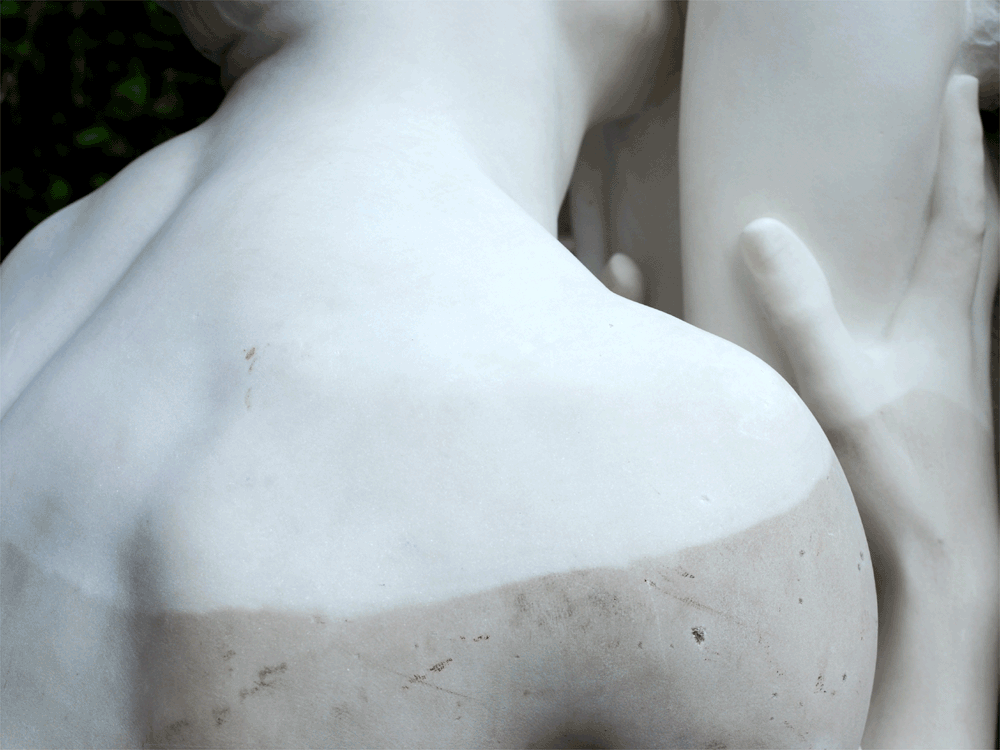 Wir haben die Skulptur mit Wasserdampf schonend gereinigt, so dass sie nun wieder in ihrer Materialität erkennbar ist. Ein Bruchstück des Sockels wurde neu geklebt und die Risse gekittet.